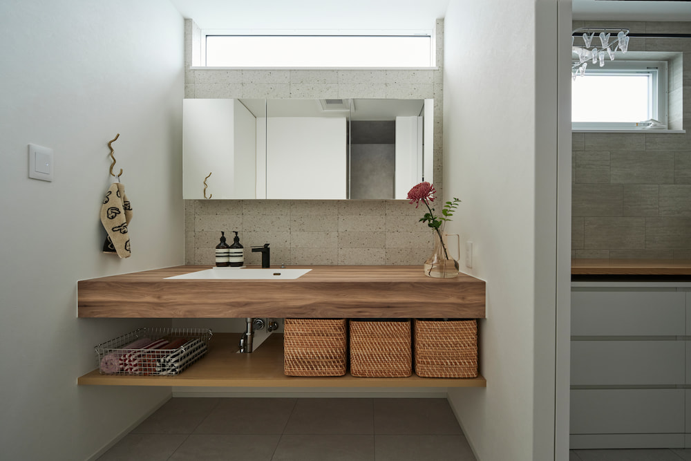 洗面台を独立させることで、「水回りを隠す」のではなく、インテリアの一部のようにこだわりをもったデザインを魅せる空間づくりが可能になります。