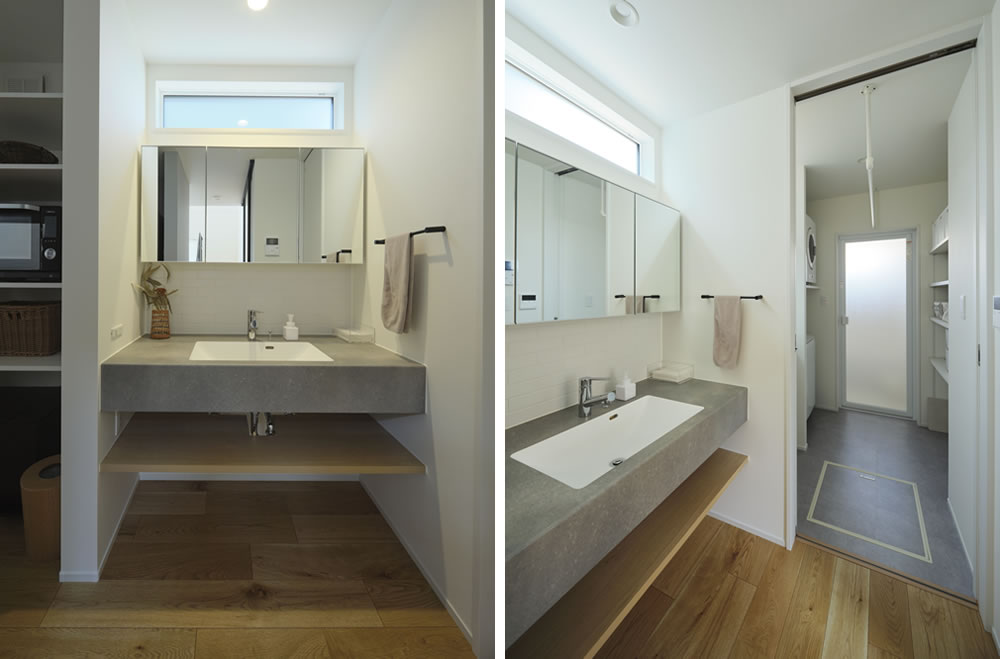 脱衣所やランドリースペースから独立している洗面台は、家族が入浴中にも洗面台を使いやすく、スムーズな生活動線とプライバシーの両方を確保できるメリットがあります。