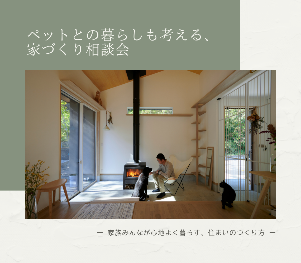 | イベント名 | ペットとの暮らしも考える、家づくり相談会 ― 家族みんなが心地よく暮らす、住まいのつくり方 ― |