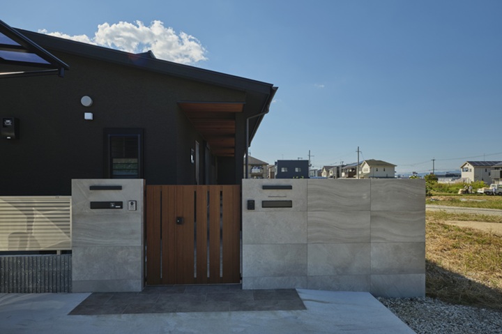 屋根や壁など黒を基調としつつ、軒天には天然木のレッドシダーやベージュがかったグレーの外壁を採用し、玄関回りをデザインのアクセントにしています。