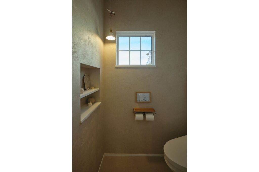 洗面と同じく窓や照明、壁紙にこだわったトイレ。ニッチの飾り棚には格子窓の雰囲気やアンティーク調の照明と調和する小物をそっと飾り、短い時間でも“好き”に包まれる空間に。トイレのリモコンも上手くインテリアで隠されています。