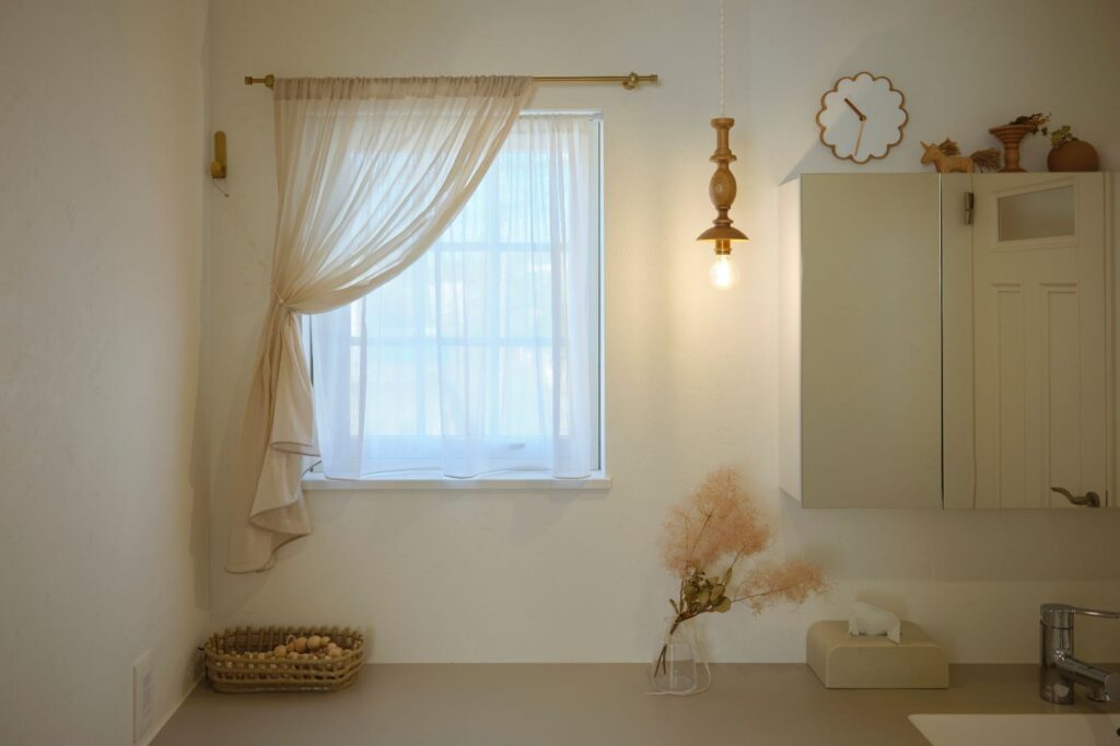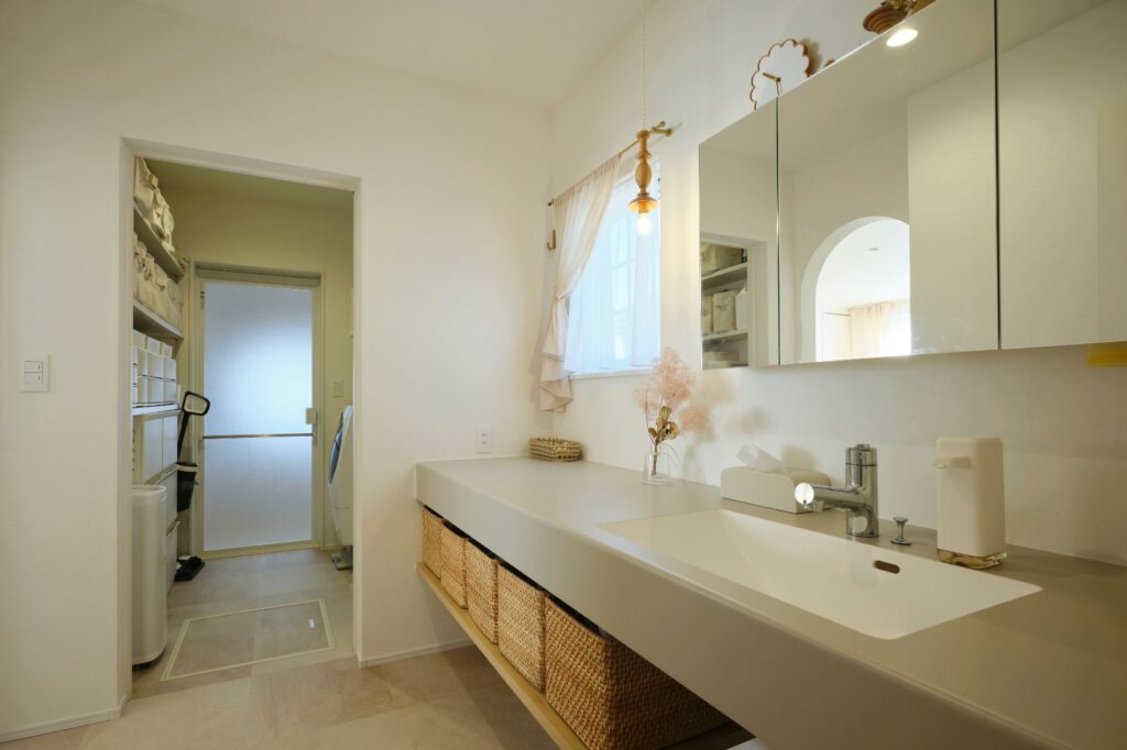 奥様が一番こだわった洗面空間。窓の形や位置、ペンダント照明、カウンターの色など全てを厳選。アンティークな部材にくすみカラーで優しさとあたたかさを感じられる空間です。