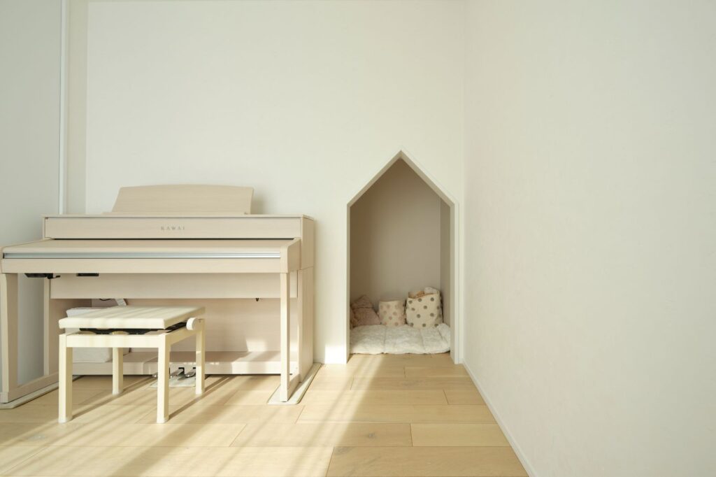 写真撮影などができるようにと設けた、真っ白で何もない壁のあるお部屋。お子様の行事ごとの写真を収めて成長を記録できます。三角の垂れ壁の向こうはヌックになっているので、お子様も秘密基地のように楽しめます。