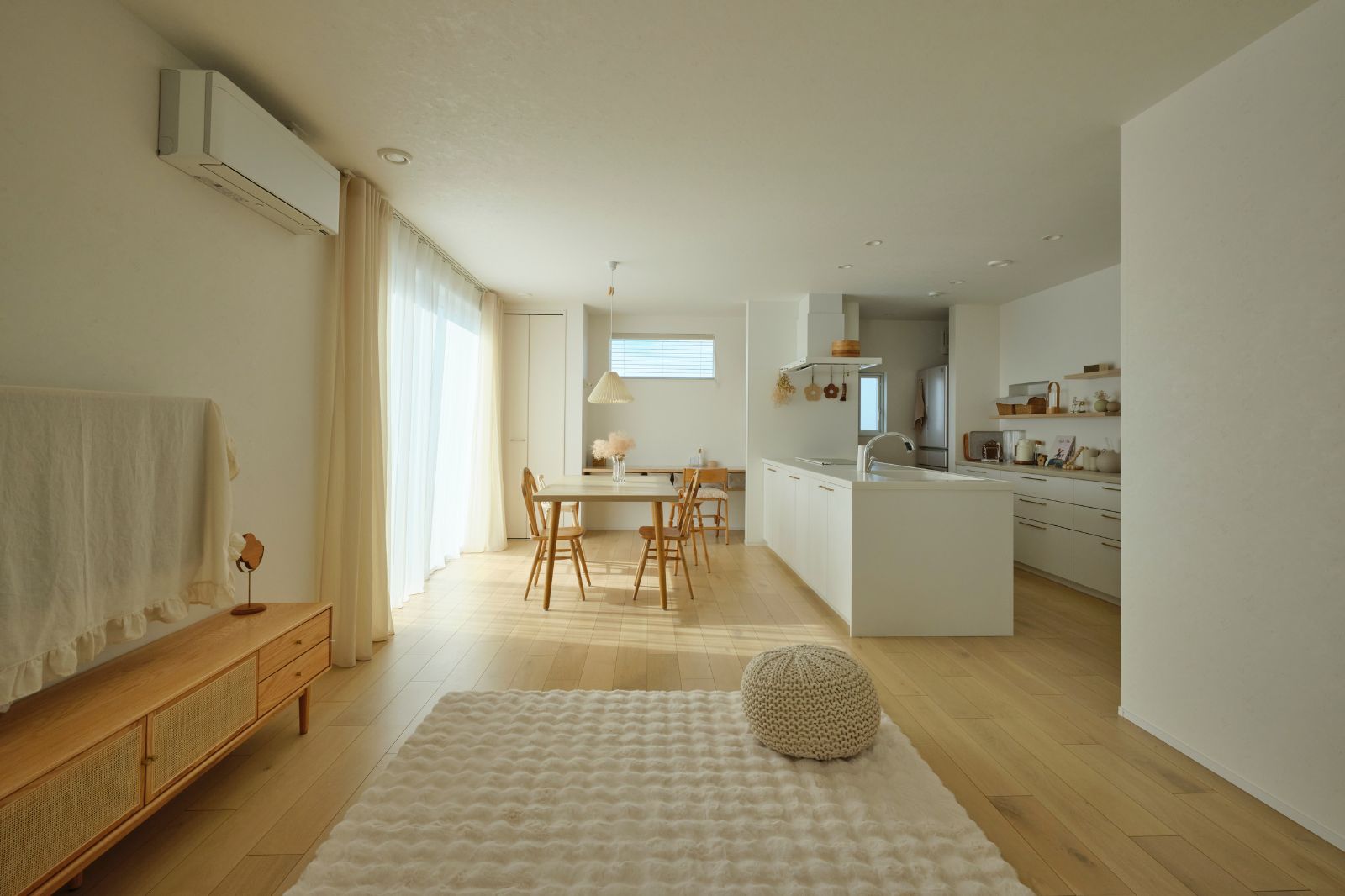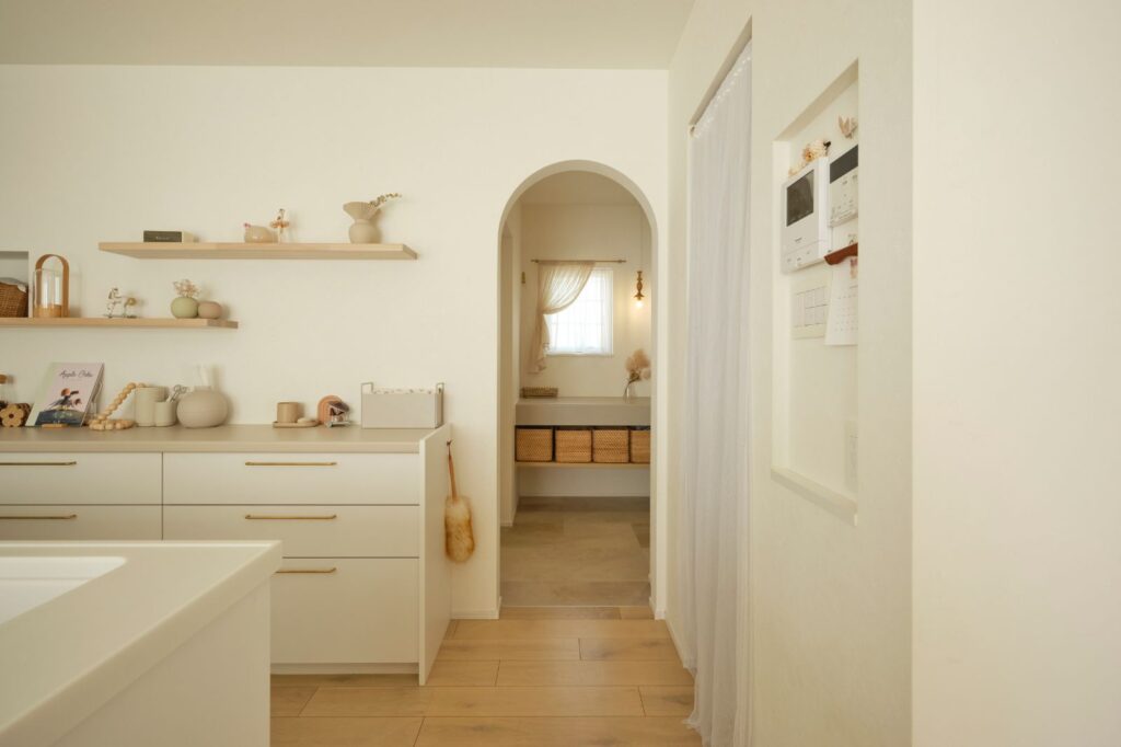 キッチン横にはファミリークローゼットを設け、レースのカーテンでふんわりと目隠し。Rの垂れ壁の奥にはゆったりとした造作洗面台が見えます。奥様の好みを反映した空間で、キッチン空間との統一感も◎