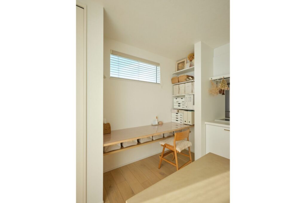 ダイニング奥に設けたスタディスペースはカウンター下と横に収納棚を設けているので、使い勝手も抜群。文房具などの小物から書類などのかさばるものまでしっかりと分類して整理しやすくなっています。