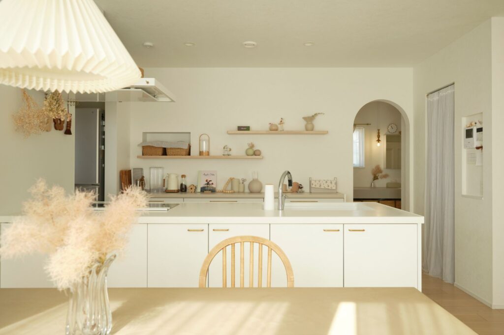 ホワイトのキッチンにグレージュやタモの木目などが温かくふんわりと柔らかな空気をつくっています。カップボードの上は見せる収納にし、季節の小物なども飾って、よりお好みの空間に。