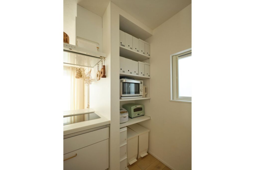 コンロ横にはキッチン家電やゴミ箱を置ける稼働棚を設置。リビングからは目立たない位置ですが、ストック用品などもラベリングした隠す収納で使いやすさと統一感があります。
