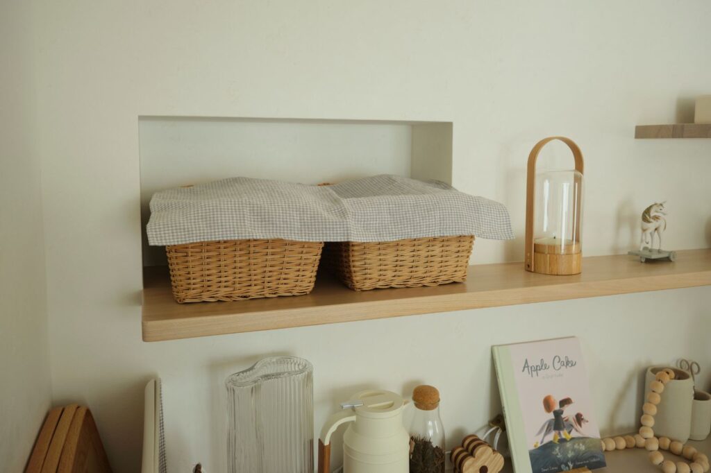 カップボードの上の飾り棚の一部分をニッチにし、奥行きのあるバスケットなども飾りながら収納。お気に入りのストウブ鍋も飾れる奥行きをとりました。