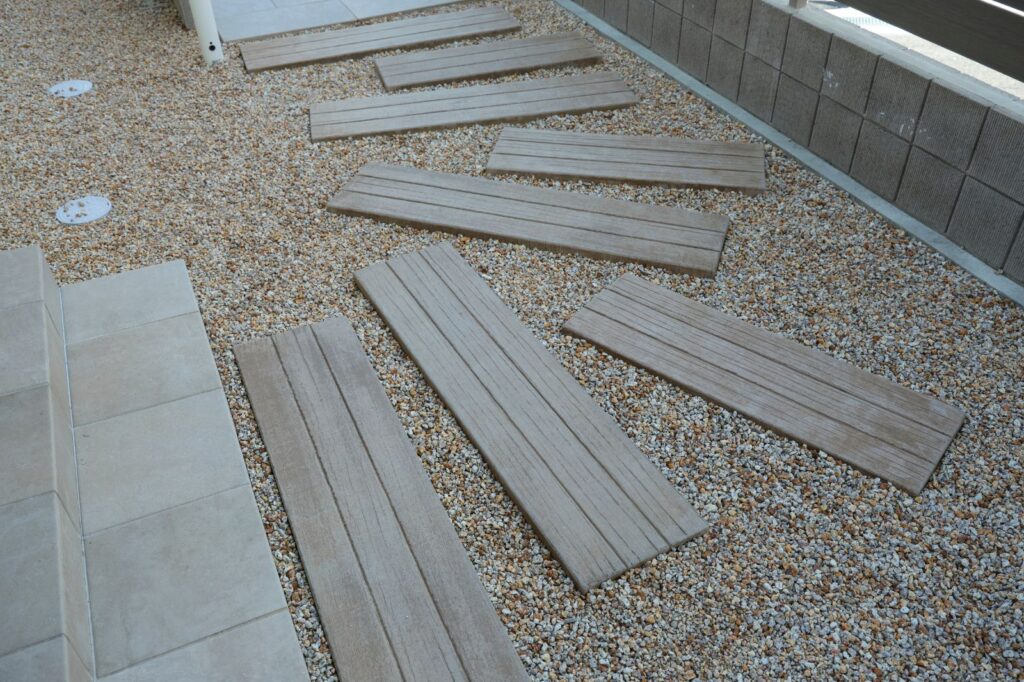 玄関へのアプローチには古木の風合いを再現した素材を飛び石のように並べ、どこか懐かしさを感じるノスタルジックな雰囲気を演出。アンティークな住まいへと続く動線として、通るたびに温かみと深みが感じられる、趣のある空間に仕上がりました。