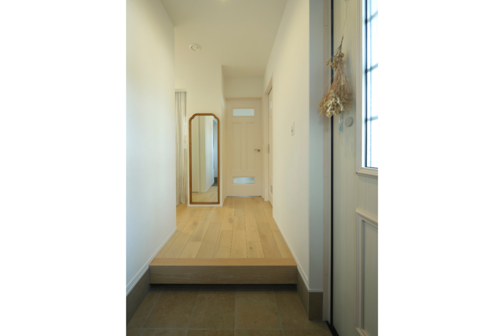 洗面、リビング、ファミリークローゼットの3方へ続く玄関ホール。アンティーク調の扉は上下にガラスが入っていて、家族の気配を感じられます。